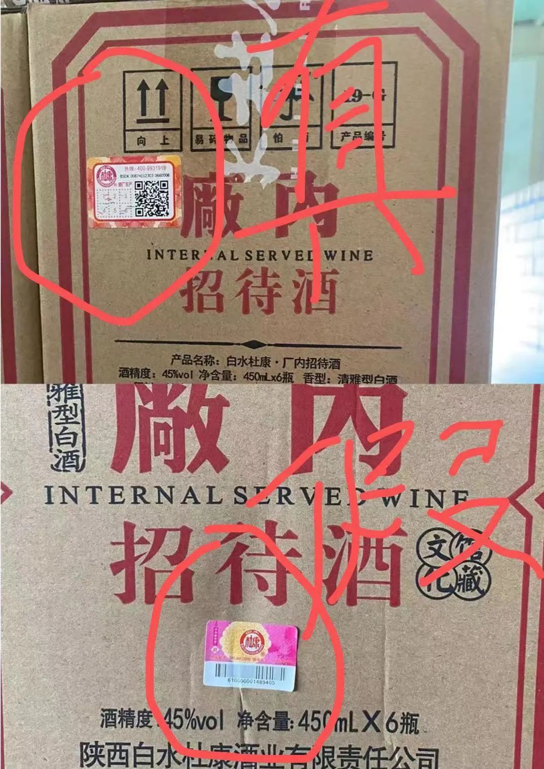 4、包裝箱防偽標與我公司的不同(位數與我公司不一致,我公司的是每個碼的數字不一致,假冒偽劣產品標碼是同一碼,貼放位置也與我公司不同,我公司防偽碼統一貼放在同一位置,假冒偽劣產品的防偽碼貼放隨意,我公司防偽碼經掃碼後可進入官網進行真偽辨別查詢,假冒偽劣產品條碼細,模糊不清,經掃碼查詢後無反應,我公司防偽標碼外邊框有專用防偽圖層顏色,假冒偽劣產品沒有)。